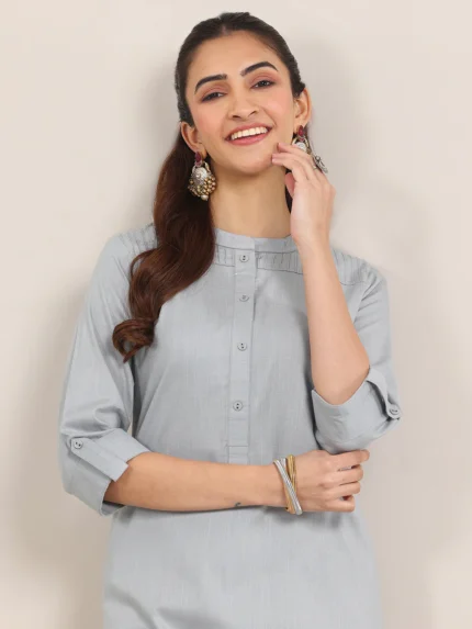 Blue Cotton Flex Solid A Line Kurta with Piping Detailing on Placket & Printed Pant LIKCFKS11