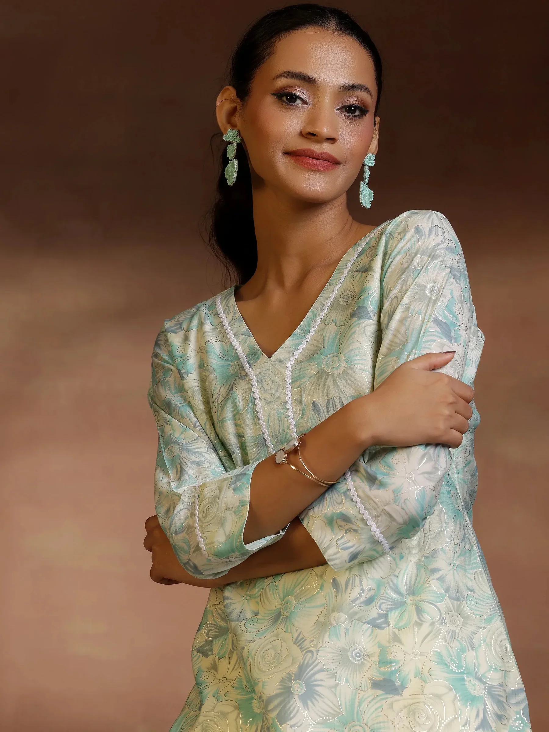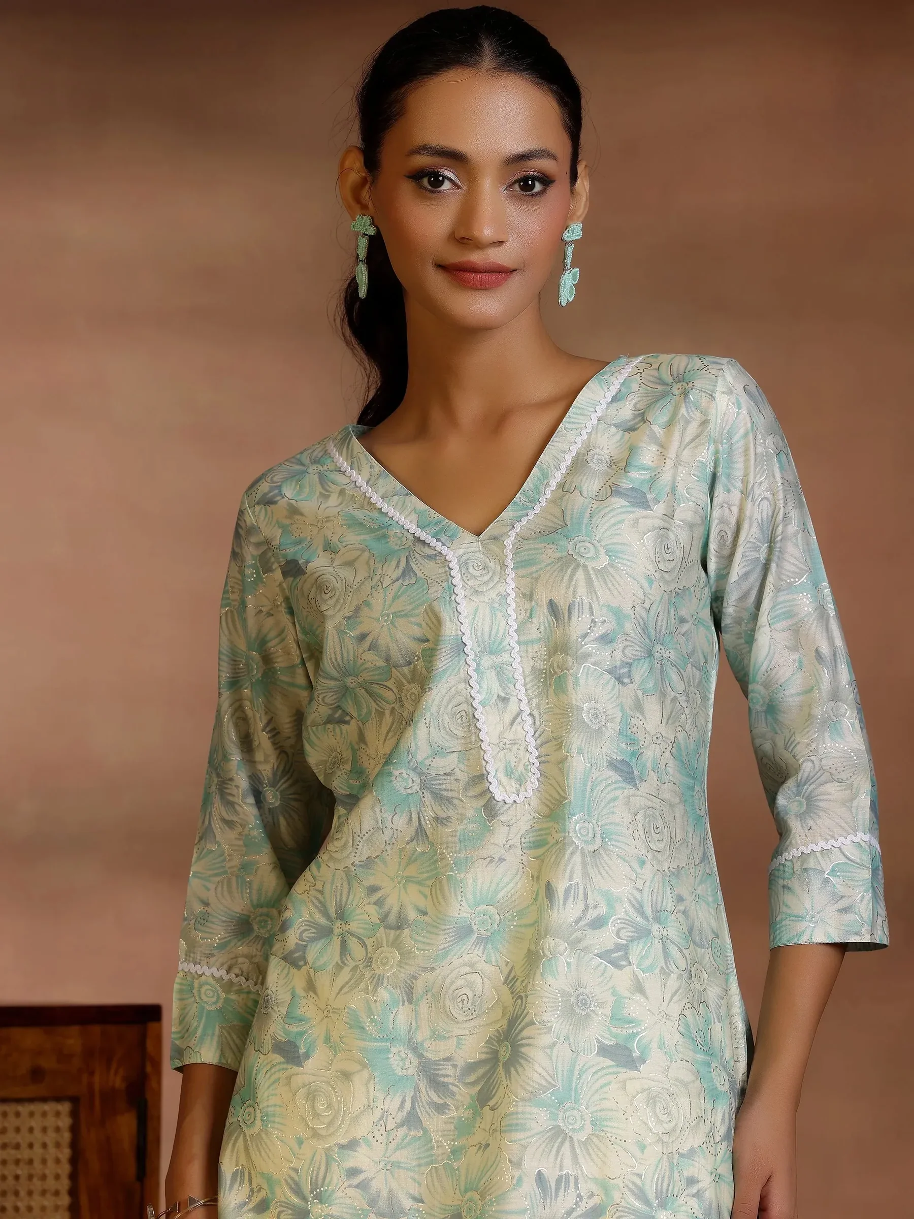 Green Printed Silk Blend Straight Kurti